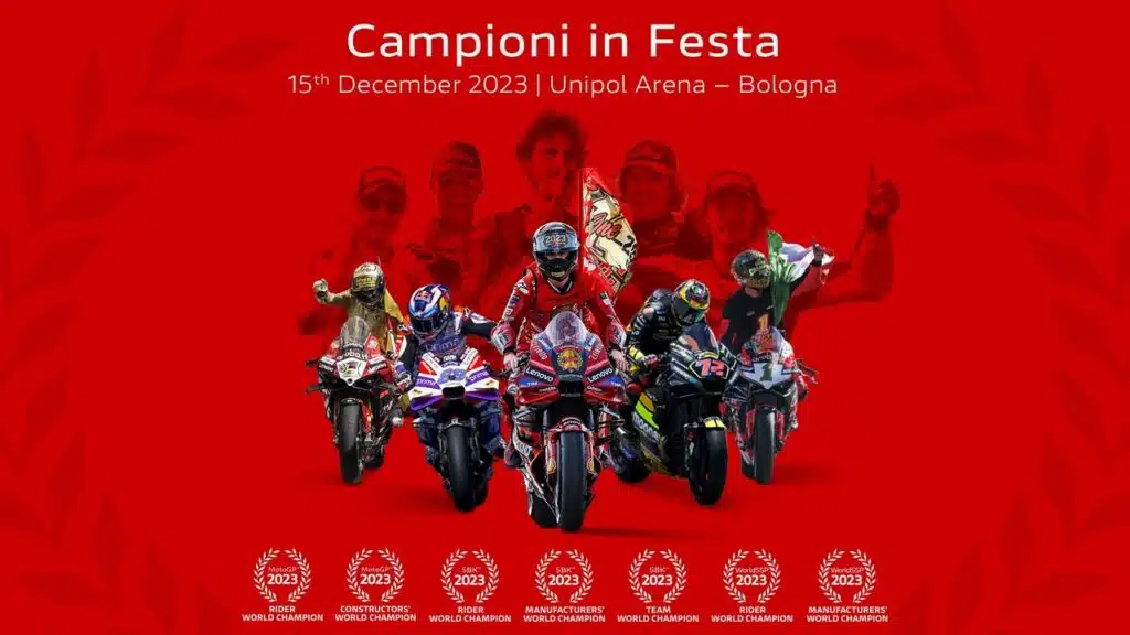MotoGP Superbike Supersport Ducati 2023 – La Ducati si prepara a celebrare le vittorie ottenute nei Campionati Mondiali di MotoGP, WorldSBK e WorldSSP invitando tutti gli appassionati a partecipare a Campioni in Festa.