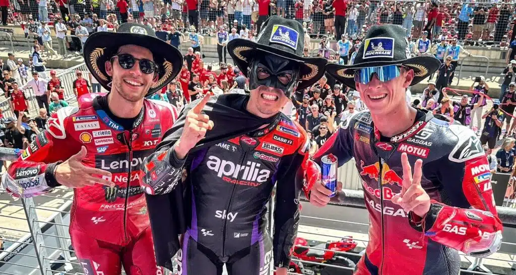 “Oggi mi sono divertito come un bimbo, era dalla Moto3 che non mi divertivo così, anche se ho fatto secondo. Gara di fuoco! Ieri ho fatto un disastro con la gomma posteriore, quando mi ha passato Jorge (Martin) alla 11, la gomma era finita. Oggi abbiamo provato la media e ringrazio il team perchè avevano più fiducia di me, hanno lavorato come dei matti per fare un weekend così. Brad (Binder) è il punto di riferimento, tutte le informazioni dei test di Pol (Espargarò) e Dani (Pedrosa) sono molto importanti. Infatti questo weekend nella Sprint abbiamo migliorato grazie anche al loro lavoro. Il mio circuito preferito? Portimao, Australia e Mugello ma non abbiamo una data per la prima vittoria, perché porta solo pressione.”