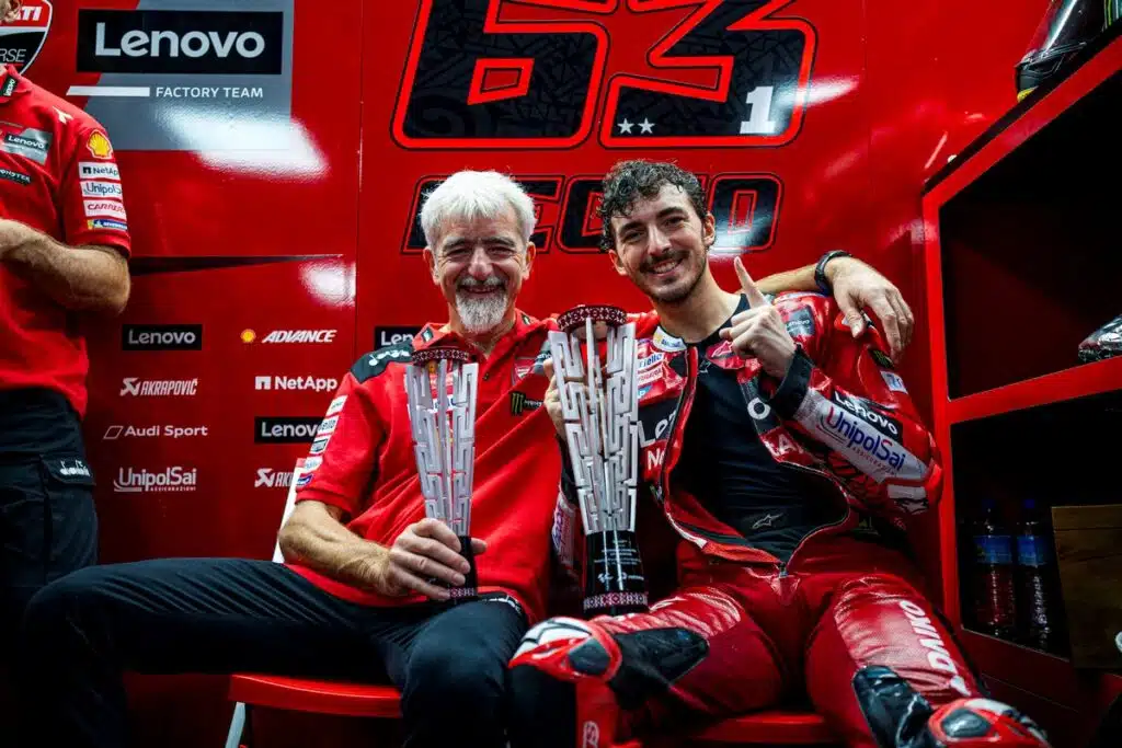 “Pecco deve ancora ritrovare il feeling – spiega a Sky Sport MotoGP – e questo mi amareggia tanto quanto mi entusiasma l’avvio squillante di Marc. Non sarò soddisfatto dei nostri risultati, per quanto già egregi, finché non gli daremo la possibilità di mettere in pista tutto il suo valore per lottare alla pari ed occupare le posizioni che gli competono nella lotta fra Campioni. Ci stiamo lavorando, dei buoni passi hanno segnato questo week end ma c’è ancora da fare per raggiungere lo scopo e vi assicuro che daremo il nostro impegno massimo per arrivarci quanto prima: con tutto rispetto Pecco non può e non deve faticare così tanto per un terzo posto, per di più senza agguantarlo, neanche mettendo in conto che è una pista a lui non congeniale.”